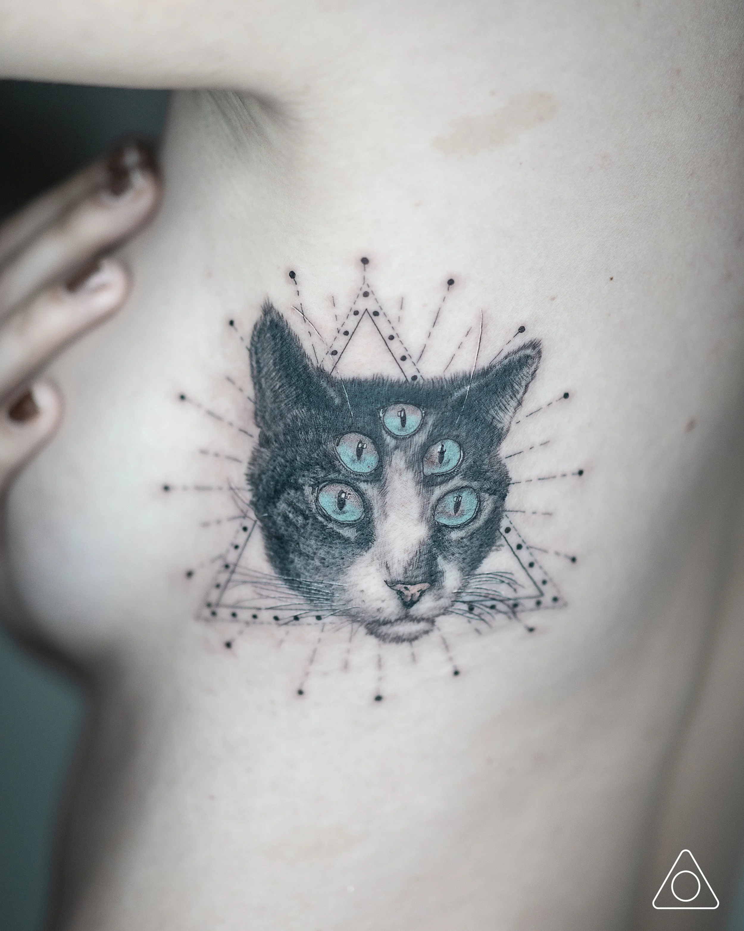This unique custom design tattoo is a combination of an Internet meme and owner’s favorite pet friend. Designed by fine line tattoo artist Gentl John in Los Angeles, CA