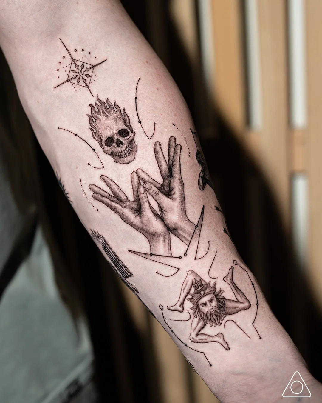 Micro-realism shading gives weight to the figures, while fine-line geometry holds the composition open and breathable. This is a tattoo made to age well, move well, and speak clearly — without explanation.
