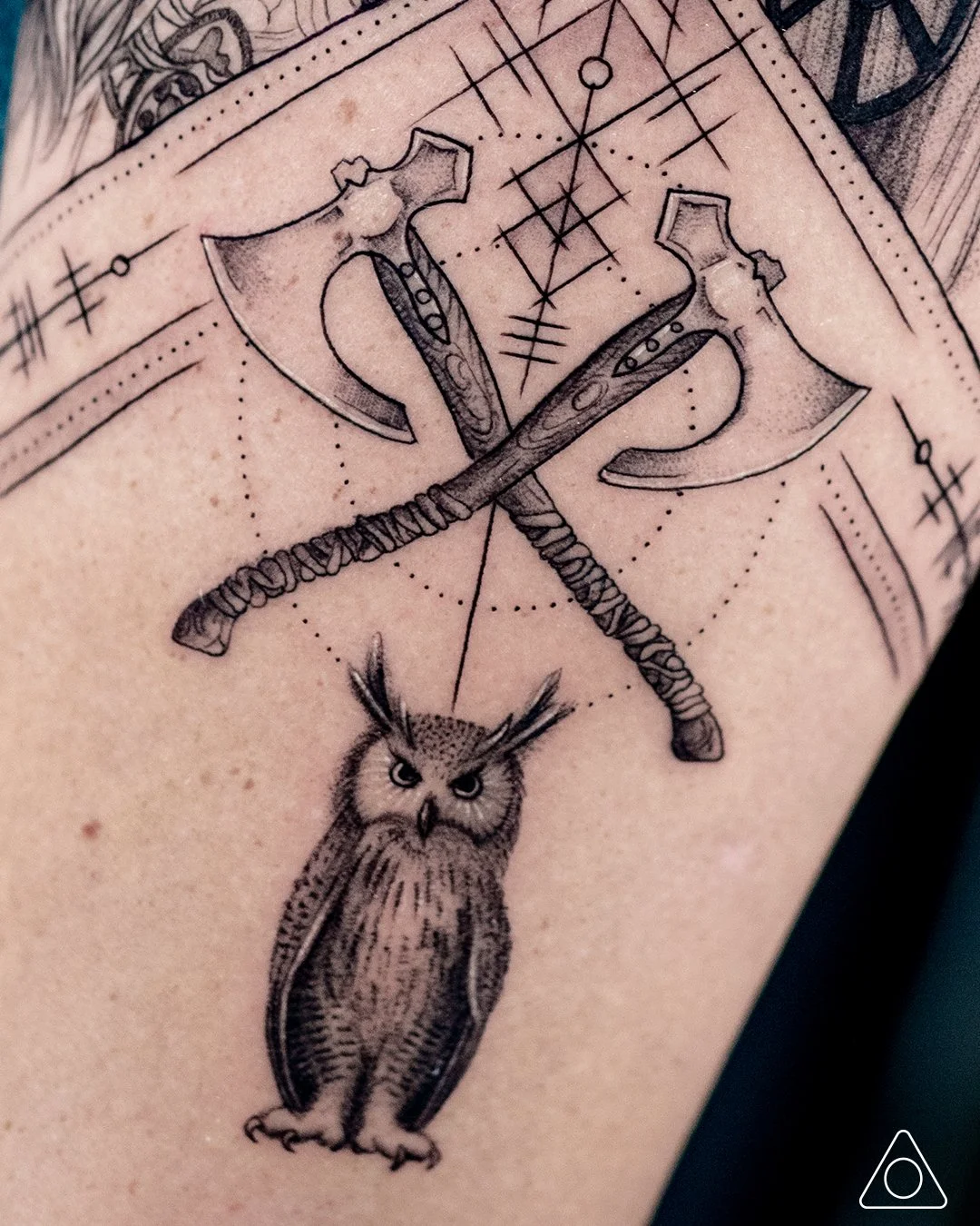 As a Los Angeles-based artist visiting Denver, I had the privilege of designing a custom tattoo inspired by Lagertha, the iconic shield maiden from Vikings. This fine-line geometric piece embodies Lagertha’s duality—her beauty, represented by a detailed portrait, and her fierce warrior spirit, symbolized by her sword. The two crossed axes at the bottom reflect her sense of justice, while the owl represents her intelligence. Adorned with Nordic symbols, this tattoo honors strong, independent women, drawing from the legacy Lagertha left in the Vikings saga. A tribute to empowerment, resilience, and wisdom, this design speaks to those forging their own paths.