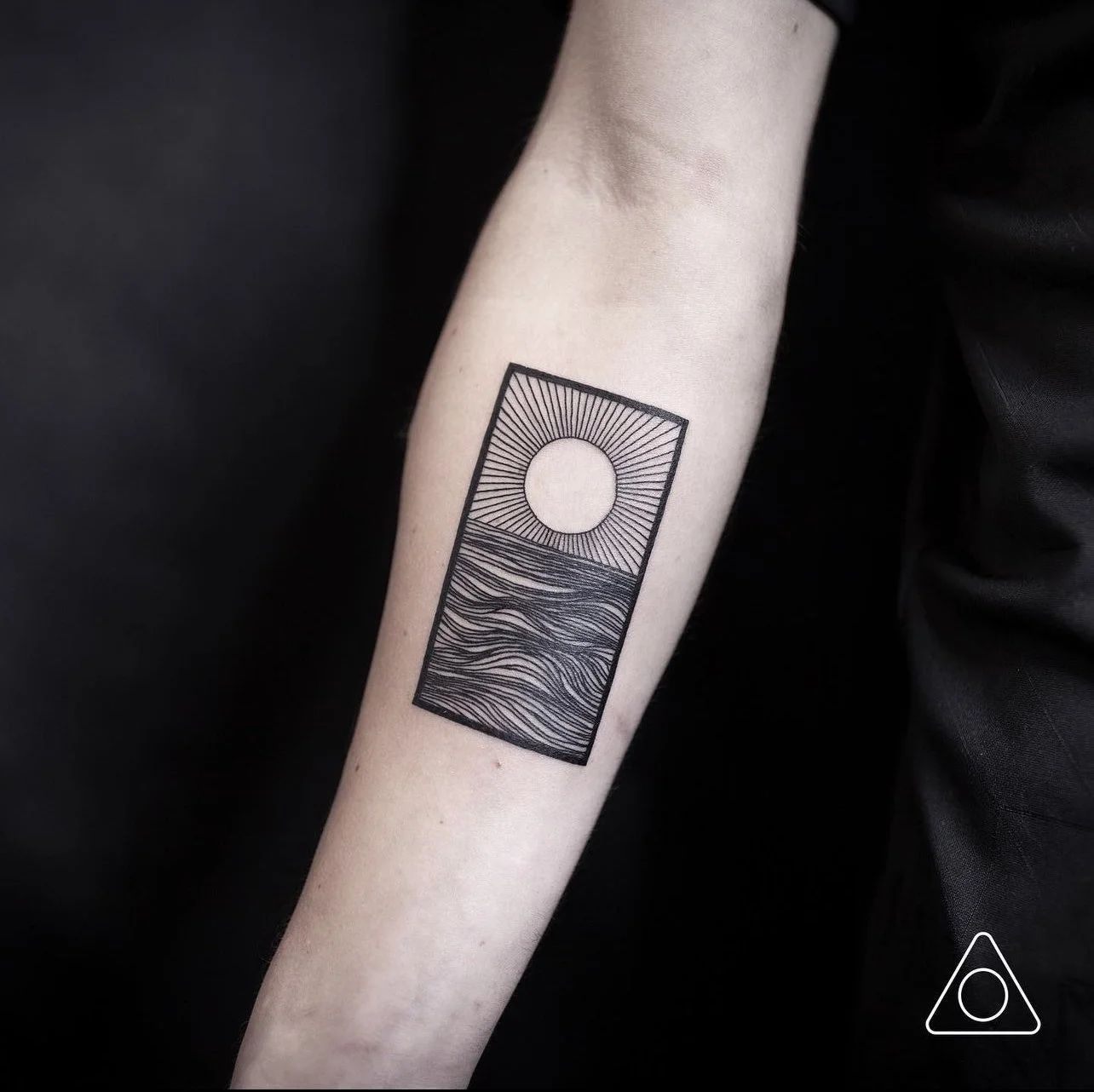 A minimalist fine line tattoo of two palm trees over a crimson sunset