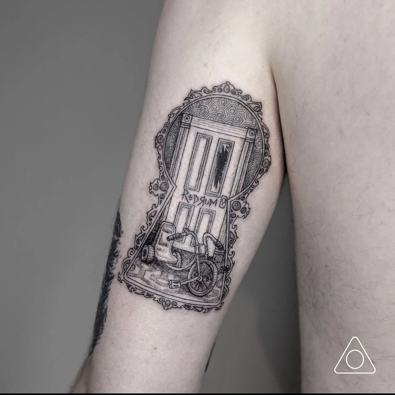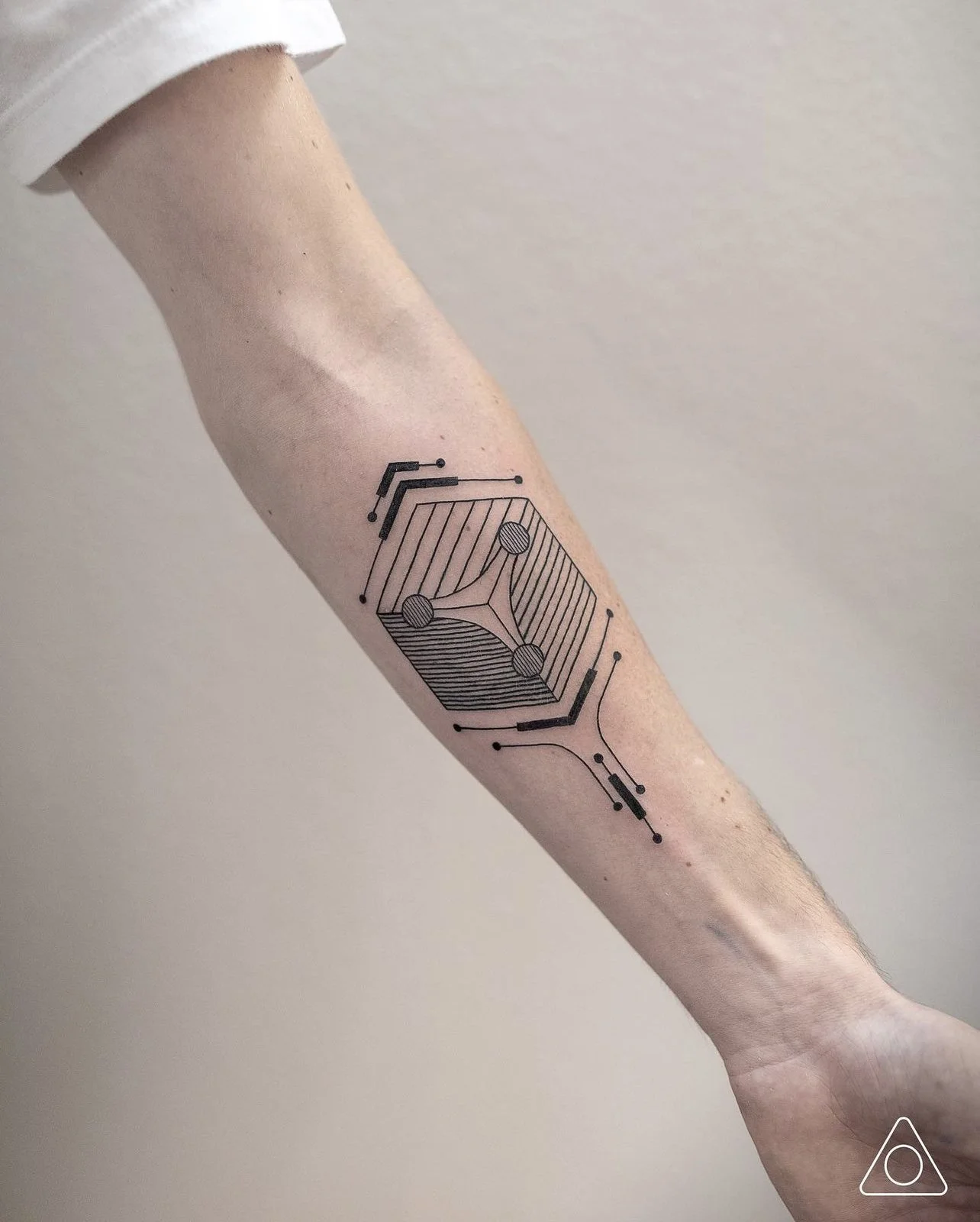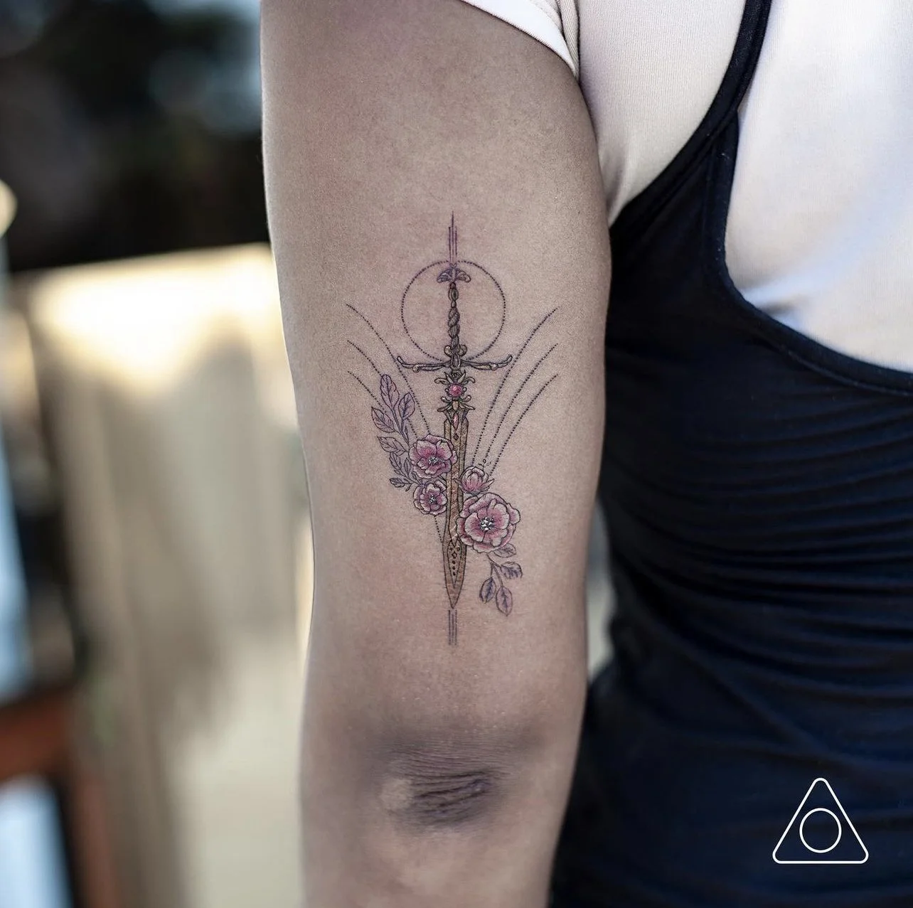 A fine line geometric color tattoo of an adventurous ship sailing over a book in the night time