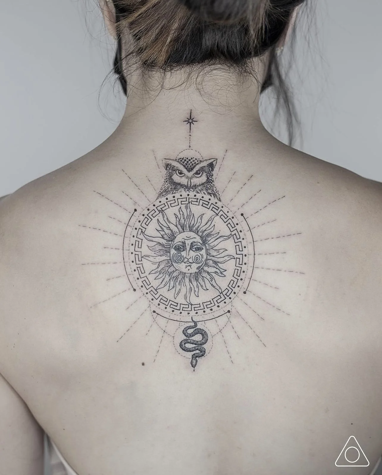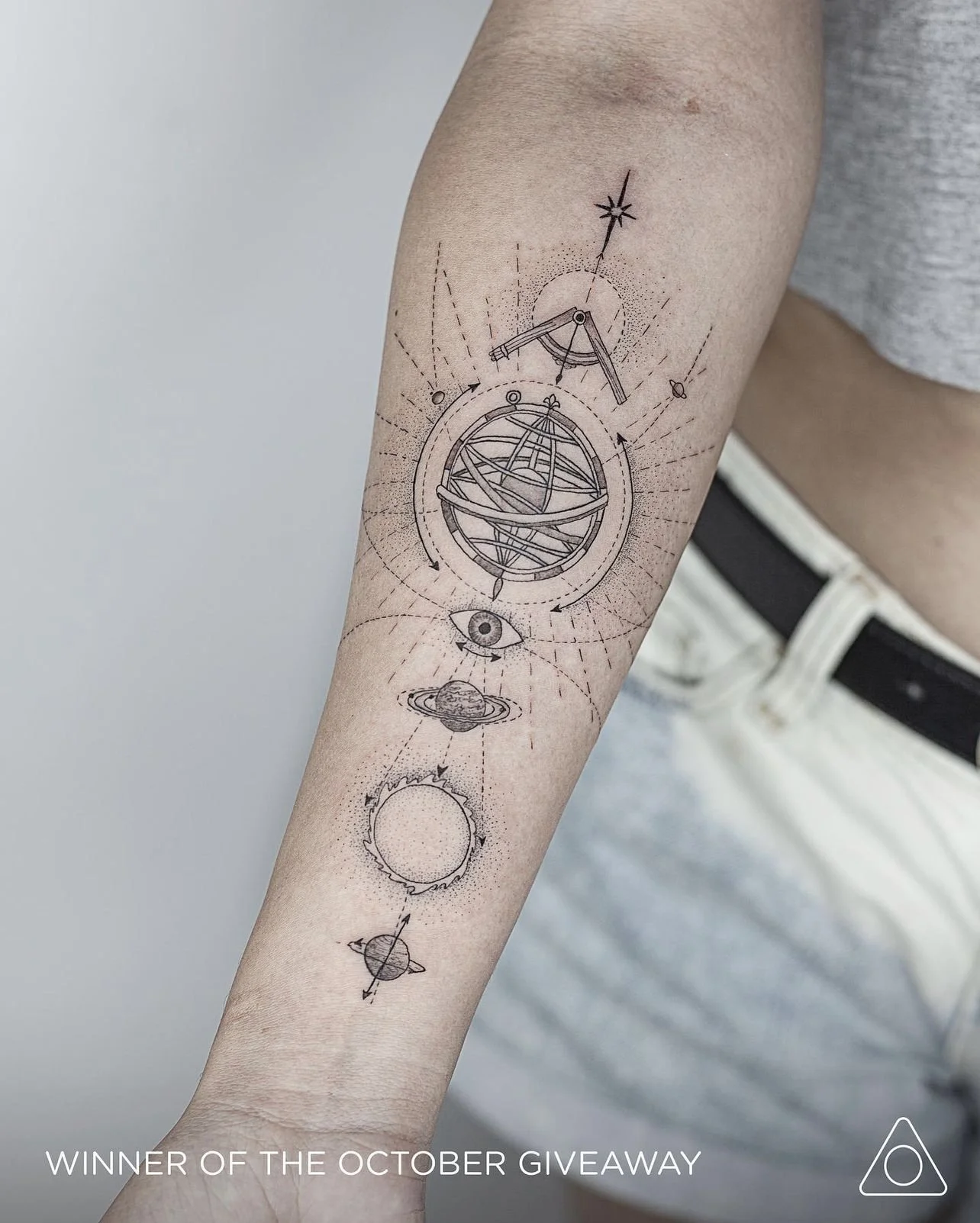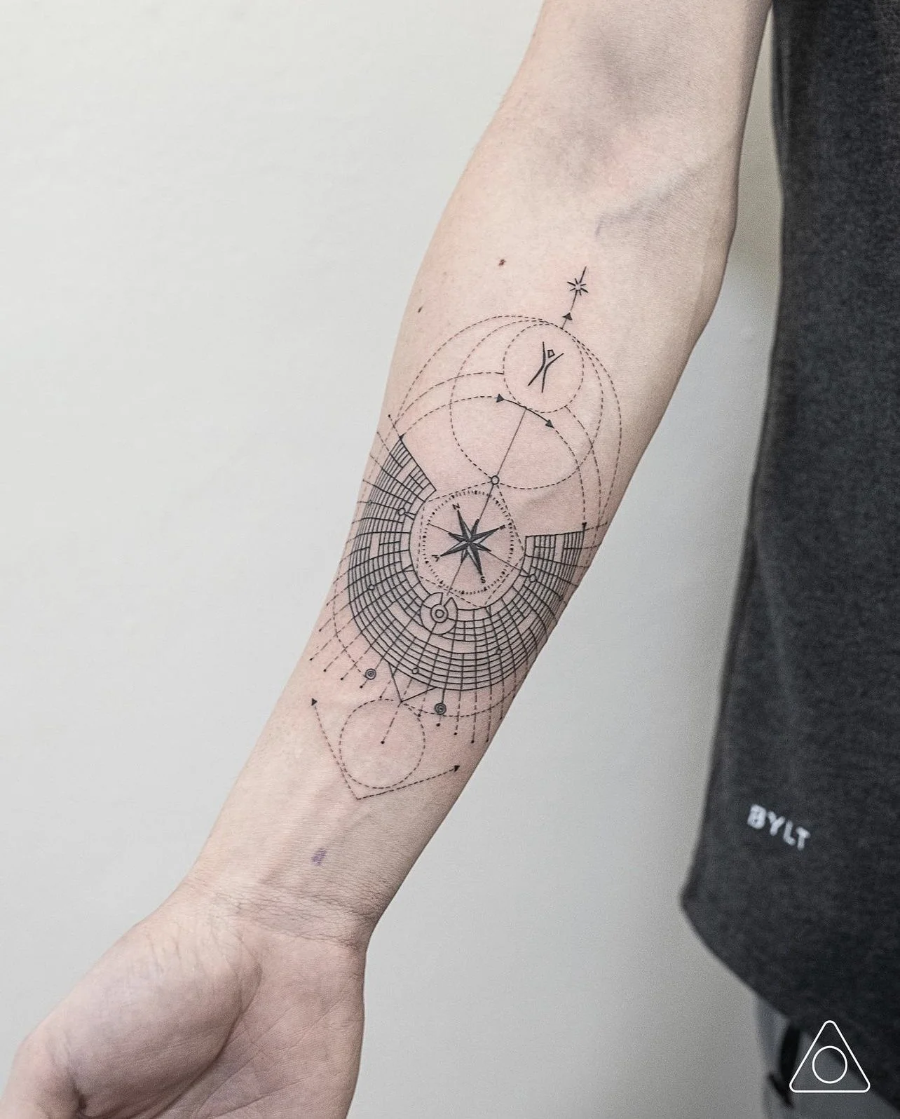 One way ticket to the outer space. Fine line geometric tattoo designed by artist Gentl John in Los Angeles