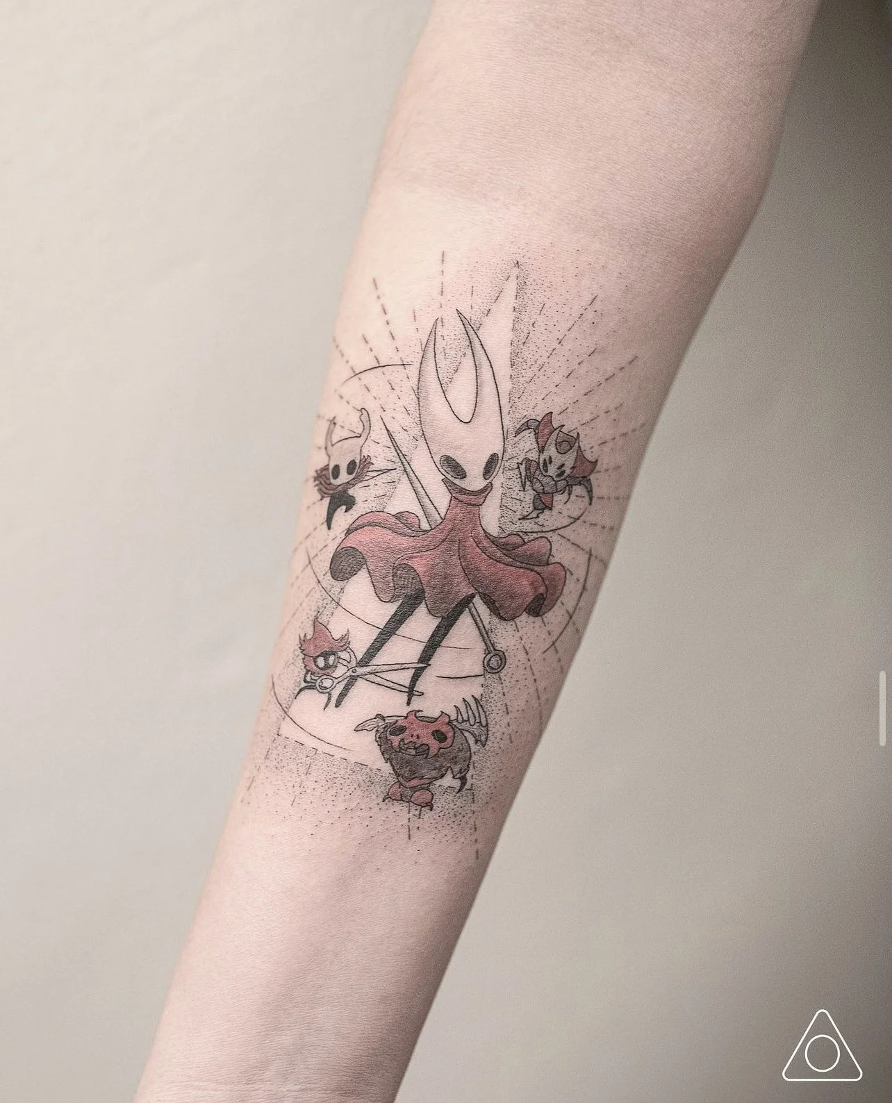 Fine line geometric color tattoo of the Huntress from the video game Hallow Knight. Designed by fine line tattoo artist Gentl John in Los Angeles.