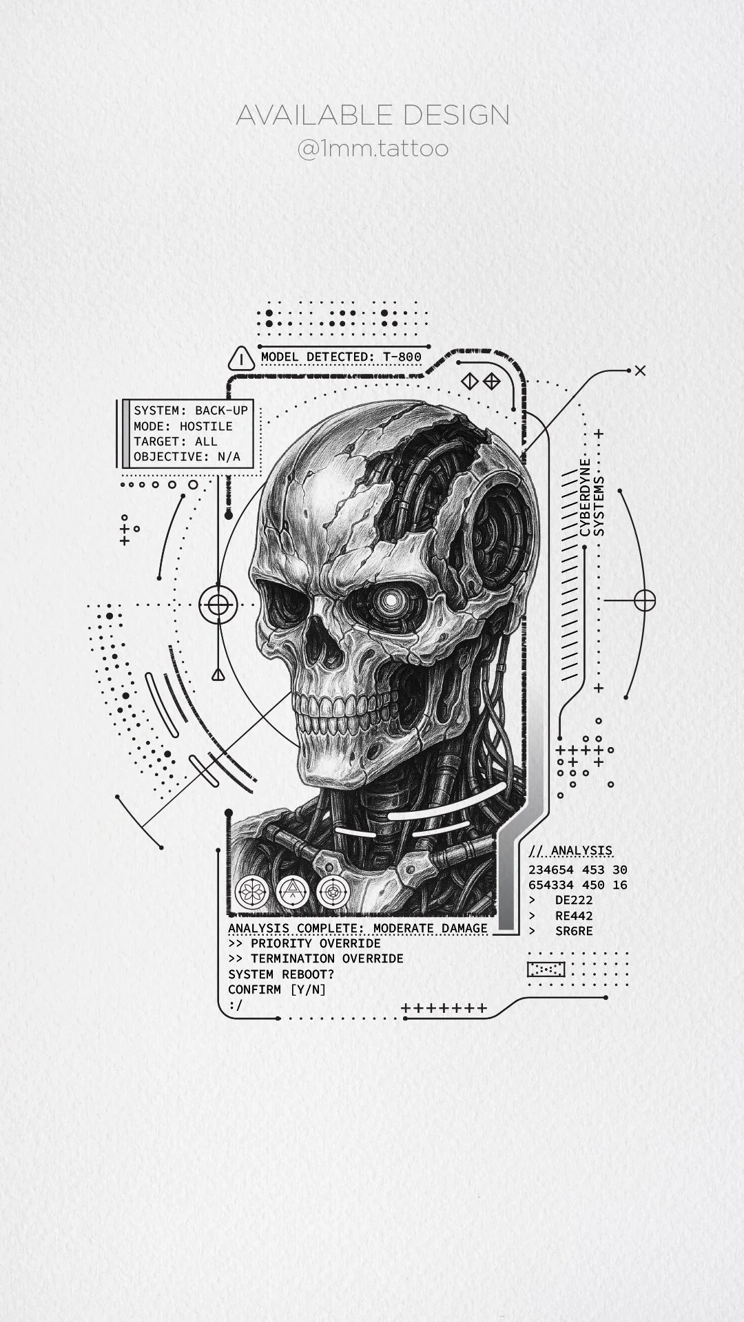 This design was born from the shadows of cinema and engineered for modern tattoo collectors who carry Terminator in their memory. If you grew up watching Judgment Day, this is your moment to immortalize it. Tap “START HERE” to book your session with 1MM Tattoo—available in Los Angeles, Denver, and more.