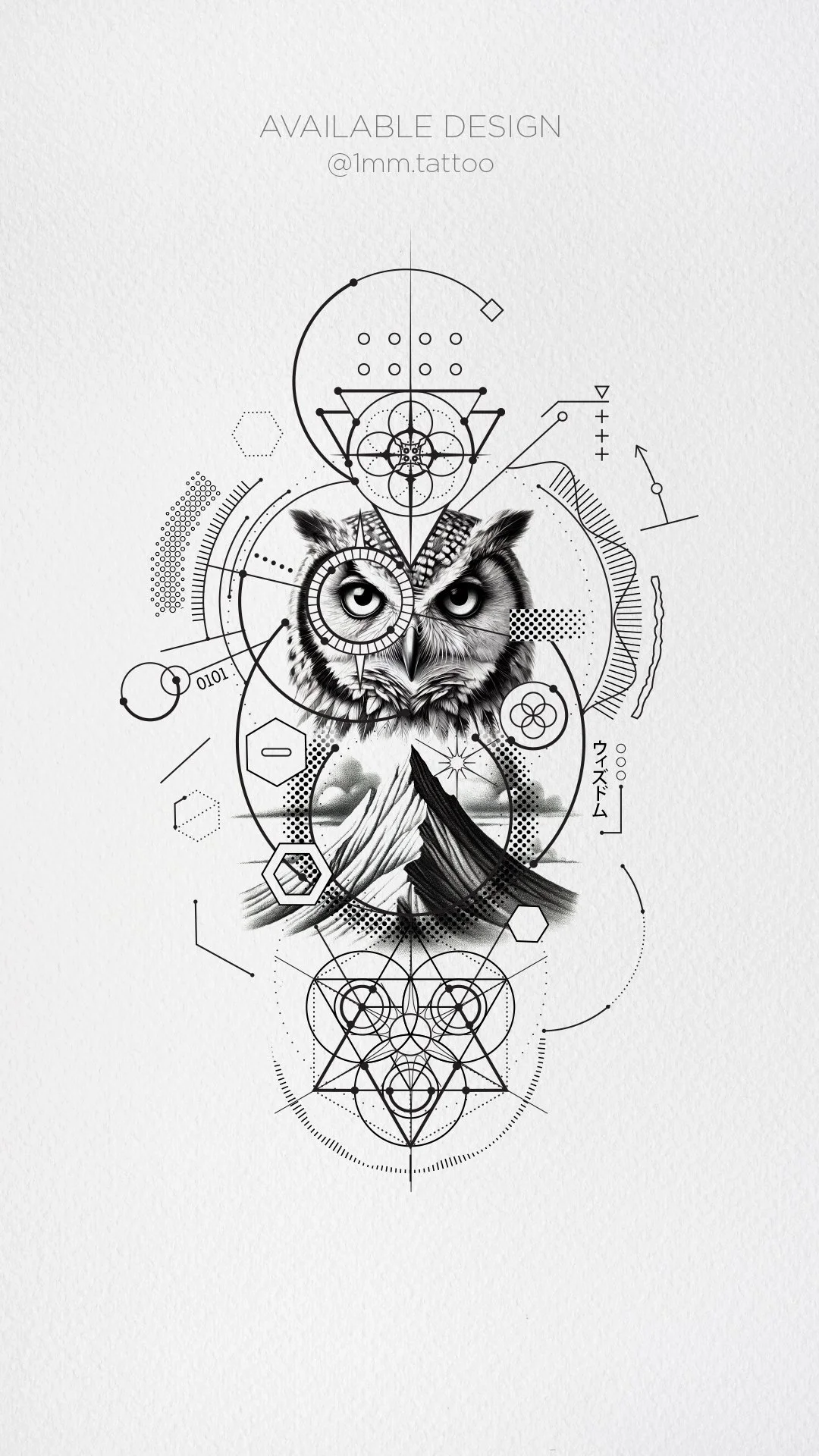 Geometric Elements – Sacred geometry frames the owl, symbolizing universal balance and order.